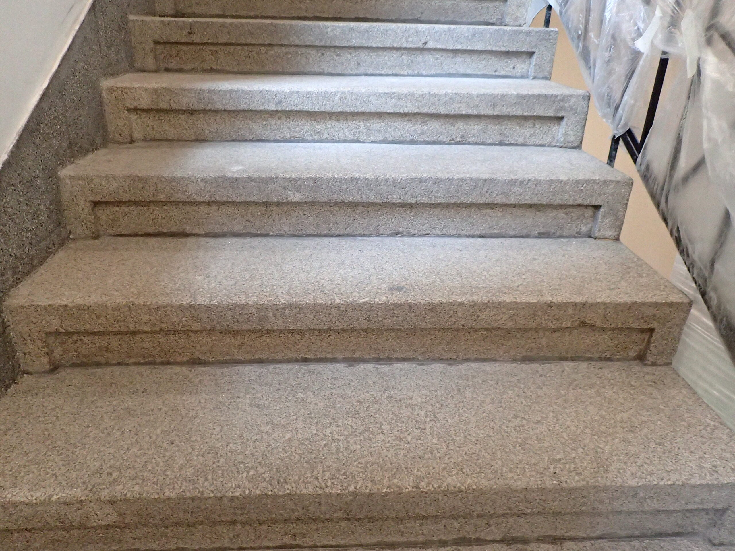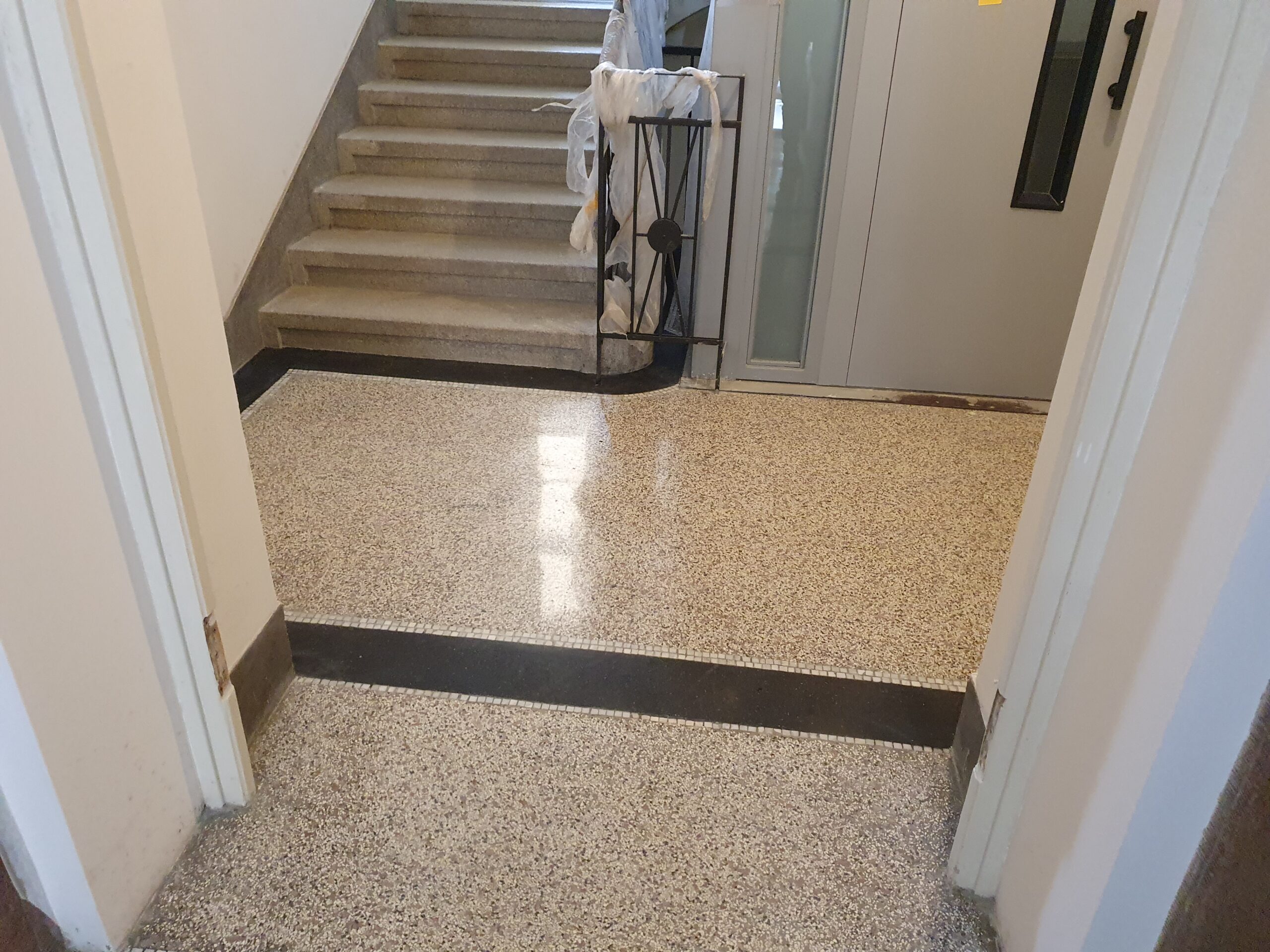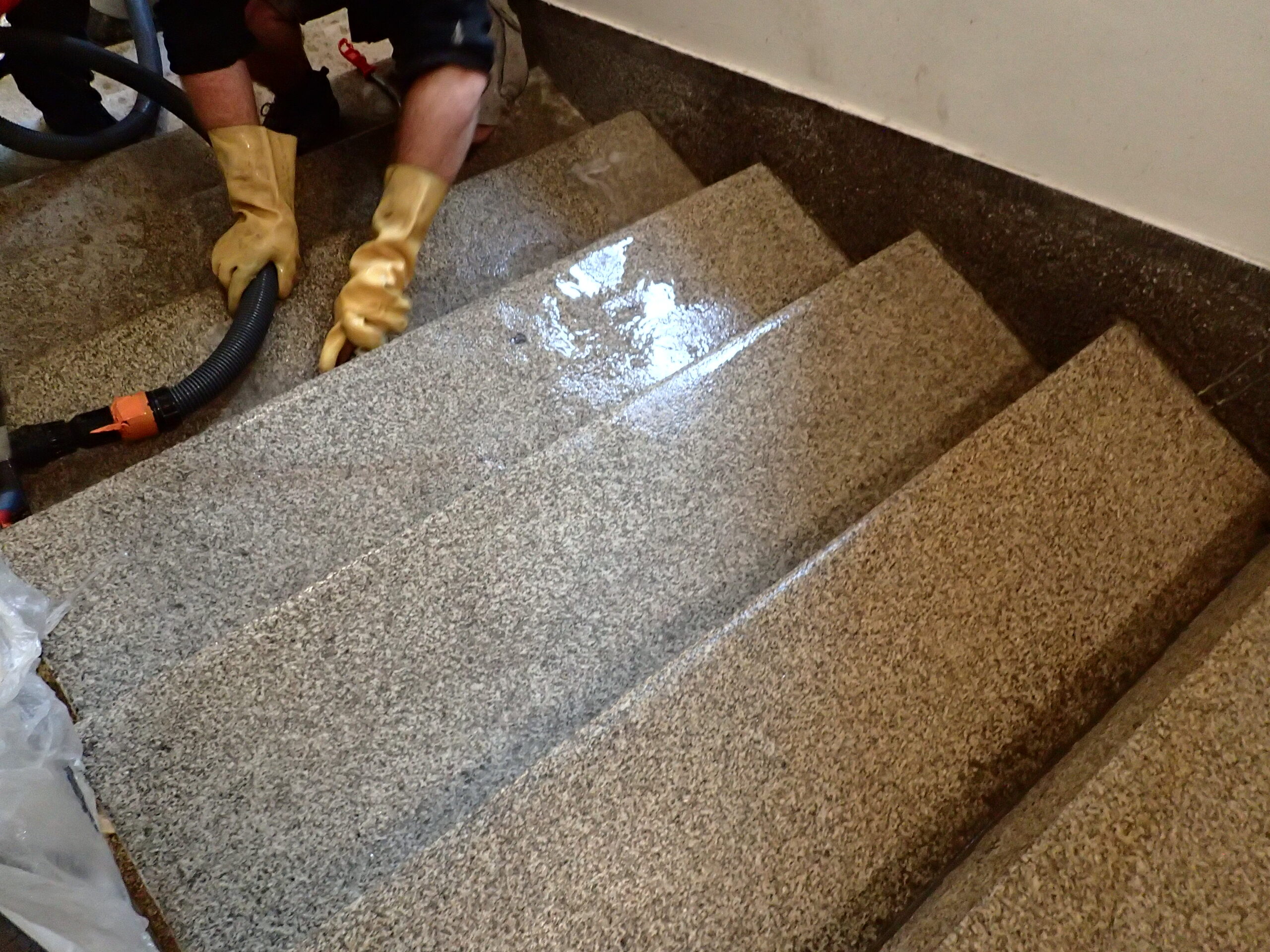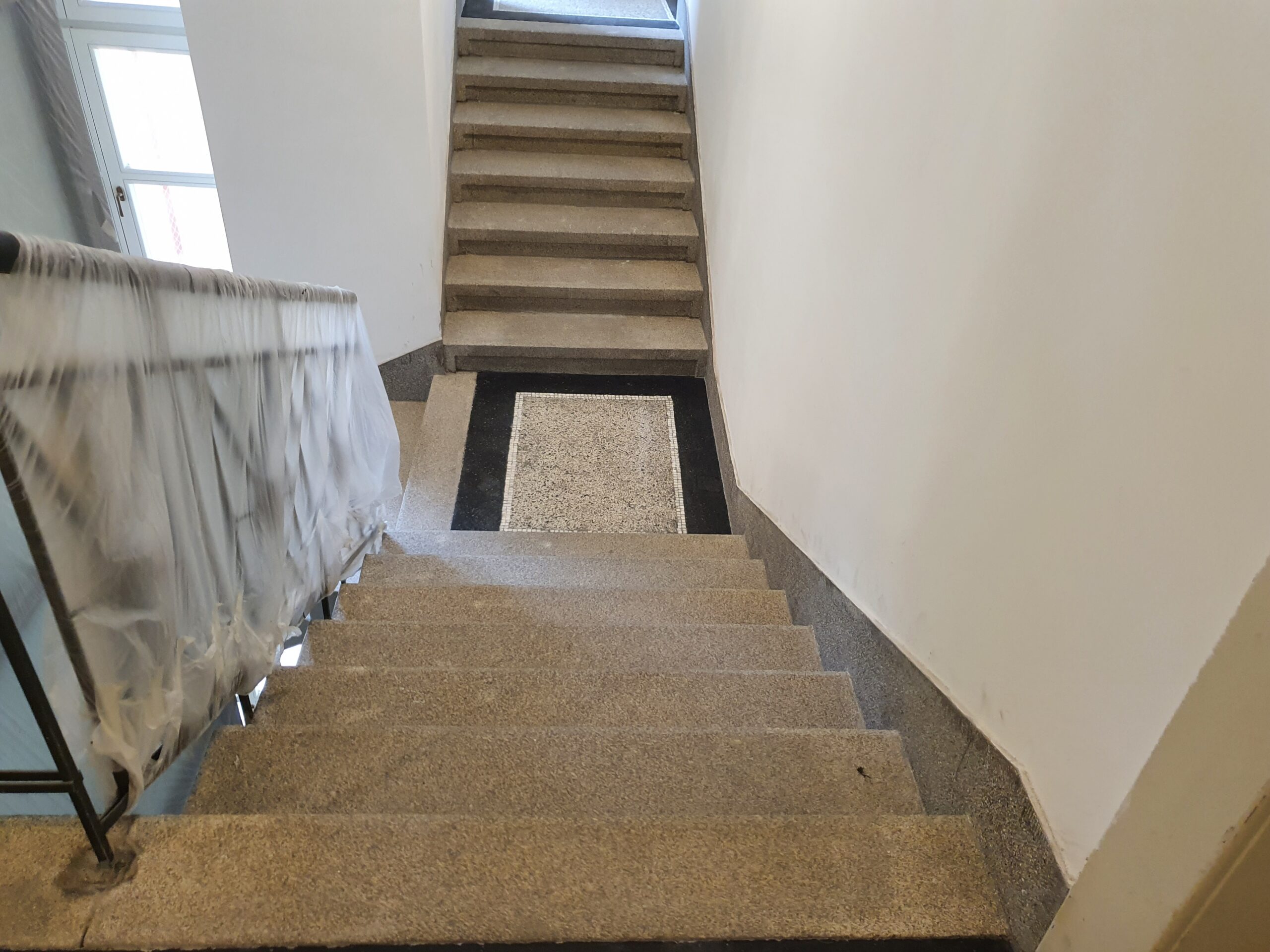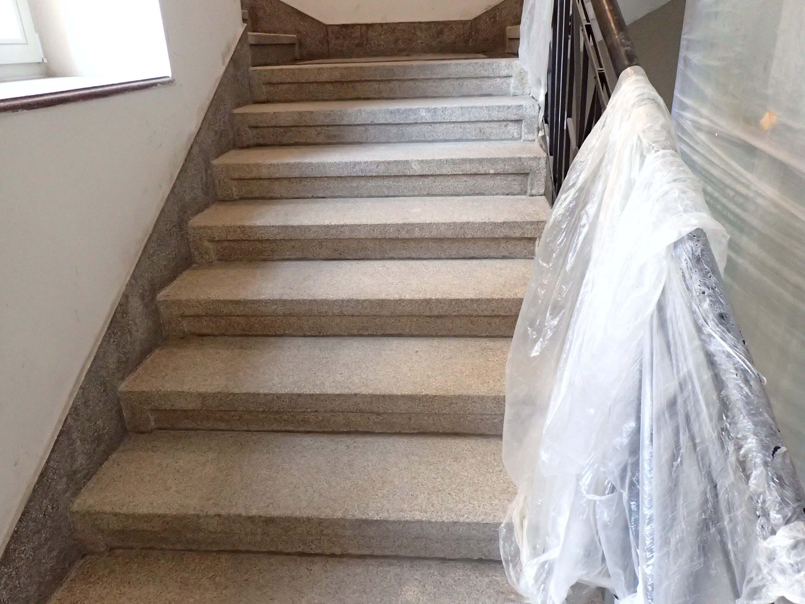 Pro SVJ Ondříčkova 9 v Praze 3 jsme zrealizovali kompletní vyčištění žulového schodiště včetně mechanického odstranění cementového nánosu a tak celkovou renovaci a opravy starého terasa. V rámci kompletní rekonstrukce domu jsme na její závěr byli požádáni o vyčištění žuly a renovaci terasa. Žulové schodiště bylo mimo klasické znečištění běžným provozem ještě silně znečištěno cementovým lepidlem především na stranách jednotlivých schodišťových stupňů. Po chemickém odstranění běžných nečistot jsme cementové nánosy odstranili jehličkovým oklepávačem a následně celý povrch dokonale odmastili. Po vyschnutí, byl žulový povrch zbavený zbytkové vlhkosti penetrován impregnací Bellinzoni Idea HP odolávající olejům a běžným kapalinám. Na jednotlivých patrech a mezaninech domu jsme sanovali terasový povrch ten následně vystěrkovali. Výtluky a díry po odstraněných plynových trubkách byly vyplněny odpovídající barevnou terasovou směsí. Ve vstupní části domy byly vyměněny části poškozených mramorových kostiček lemující černé bordury. Po vyleštění plochy terasa do zrcadlového lesku byla celá plocha impregnována impregnací Bellinzoni Idea. Na výsledek naší měsíční práce se můžete podívat v přiložené galerii.
