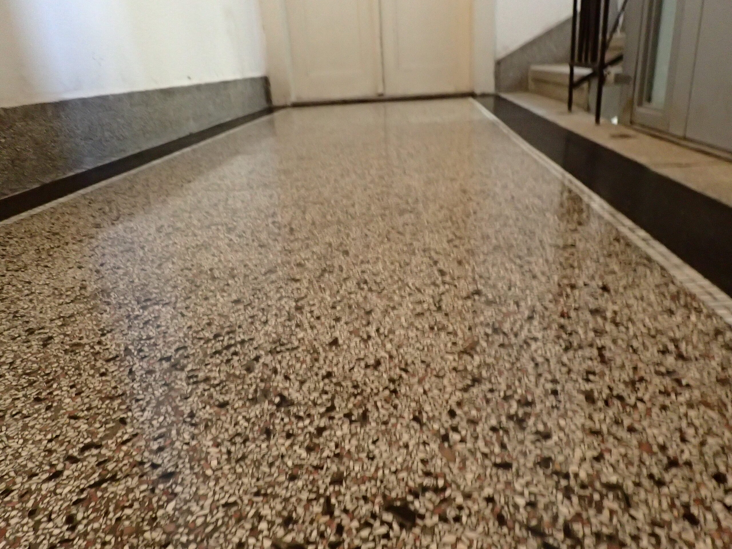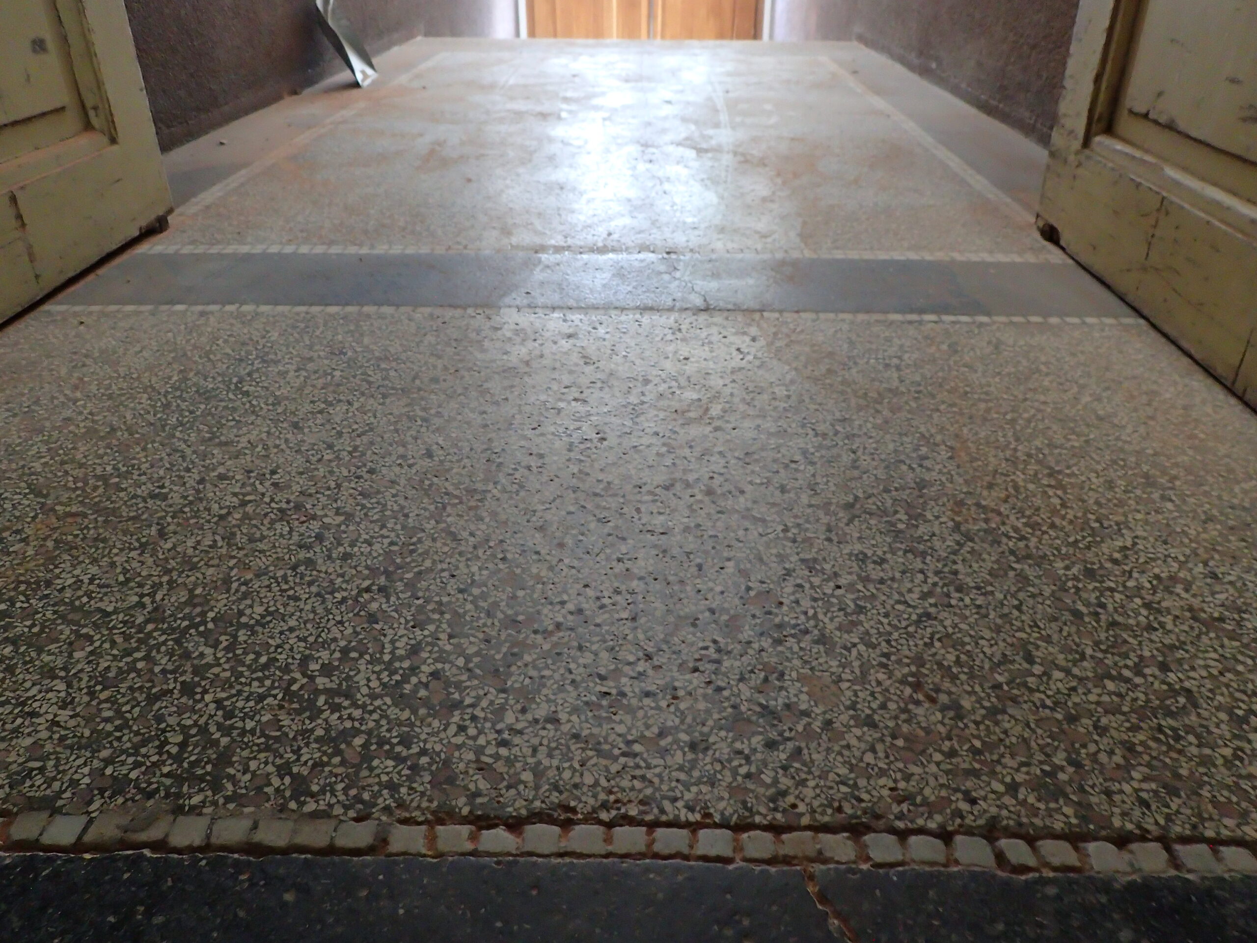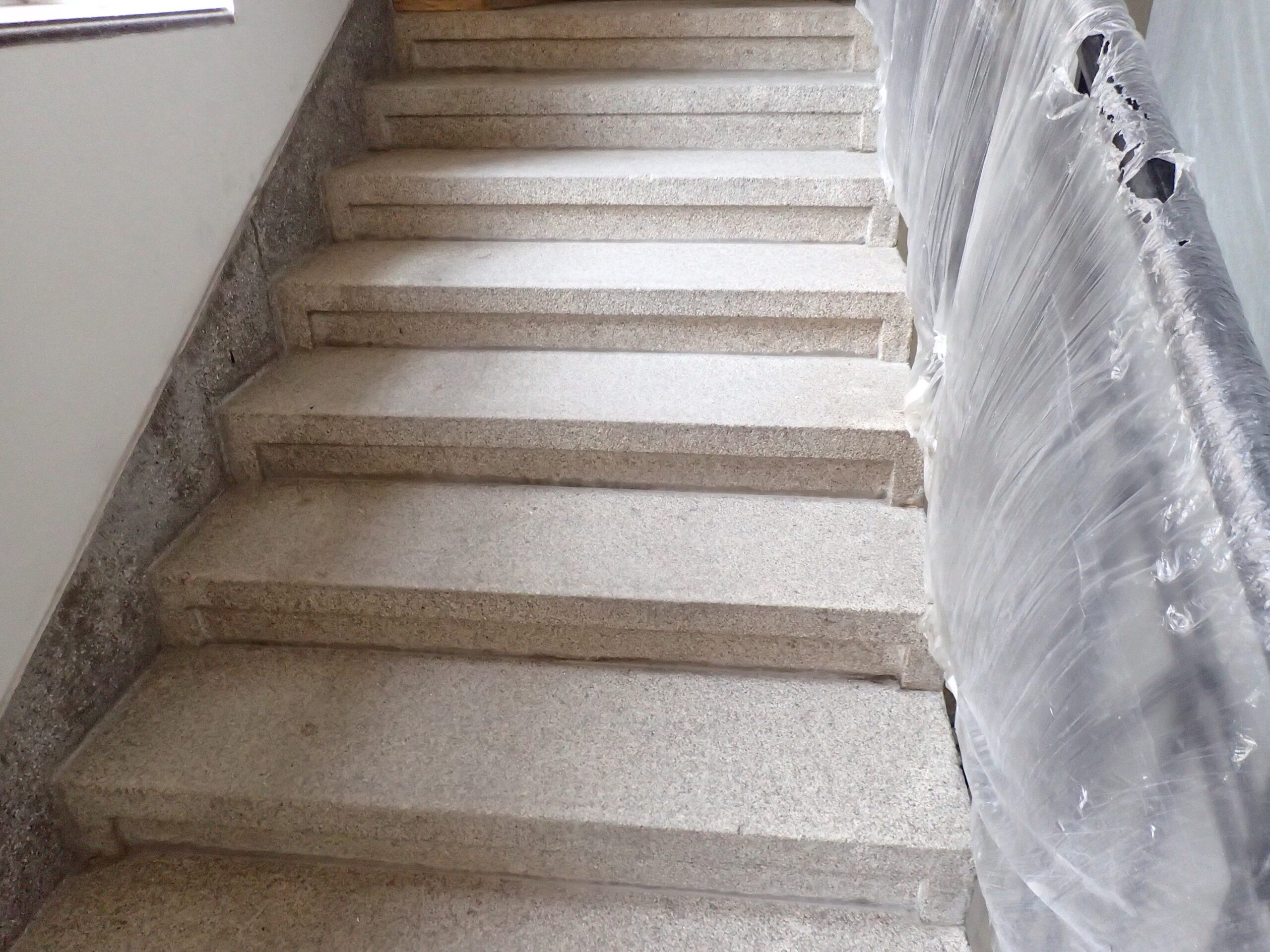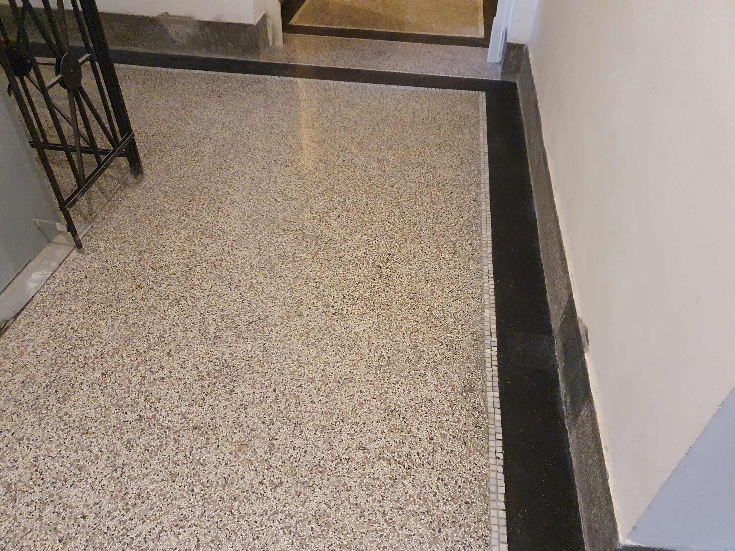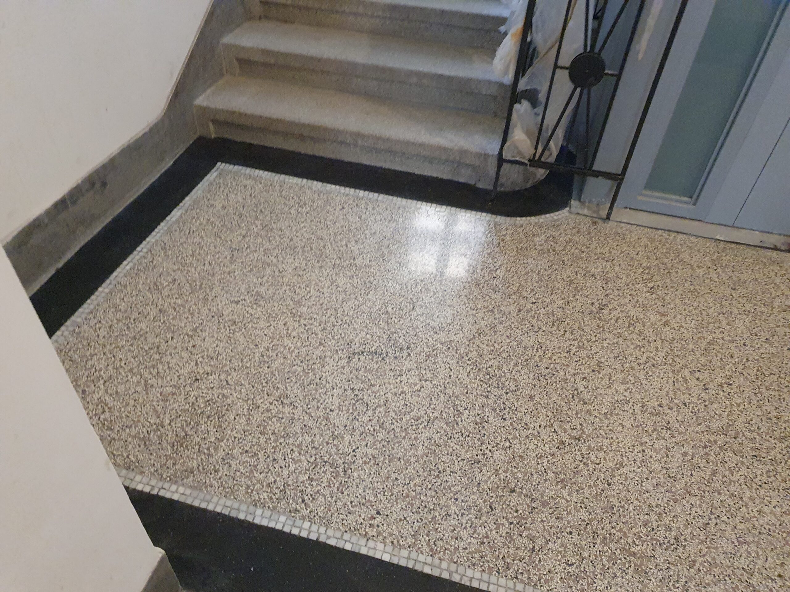 Pro SVJ Ondříčkova 9 v Praze 3 jsme zrealizovali kompletní vyčištění žulového schodiště včetně mechanického odstranění cementového nánosu a tak celkovou renovaci a opravy starého terasa. V rámci kompletní rekonstrukce domu jsme na její závěr byli požádáni o vyčištění žuly a renovaci terasa. Žulové schodiště bylo mimo klasické znečištění běžným provozem ještě silně znečištěno cementovým lepidlem především na stranách jednotlivých schodišťových stupňů. Po chemickém odstranění běžných nečistot jsme cementové nánosy odstranili jehličkovým oklepávačem a následně celý povrch dokonale odmastili. Po vyschnutí, byl žulový povrch zbavený zbytkové vlhkosti penetrován impregnací Bellinzoni Idea HP odolávající olejům a běžným kapalinám. Na jednotlivých patrech a mezaninech domu jsme sanovali terasový povrch ten následně vystěrkovali. Výtluky a díry po odstraněných plynových trubkách byly vyplněny odpovídající barevnou terasovou směsí. Ve vstupní části domy byly vyměněny části poškozených mramorových kostiček lemující černé bordury. Po vyleštění plochy terasa do zrcadlového lesku byla celá plocha impregnována impregnací Bellinzoni Idea. Na výsledek naší měsíční práce se můžete podívat v přiložené galerii.